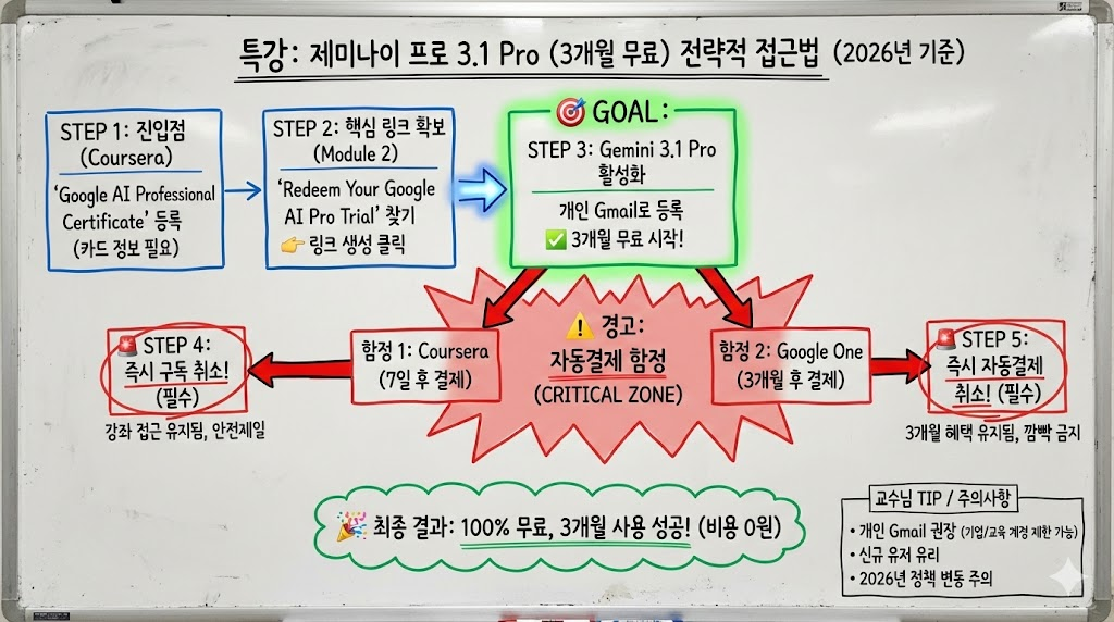 Google AI Pro(Gemini 3.1 Pro) 3개월 무료 체험을 안전하게 사용하는 방법을 2026년 기준으로 정리했습니다. Coursera 등록부터 자동결제 취소까지 단계별 가이드.